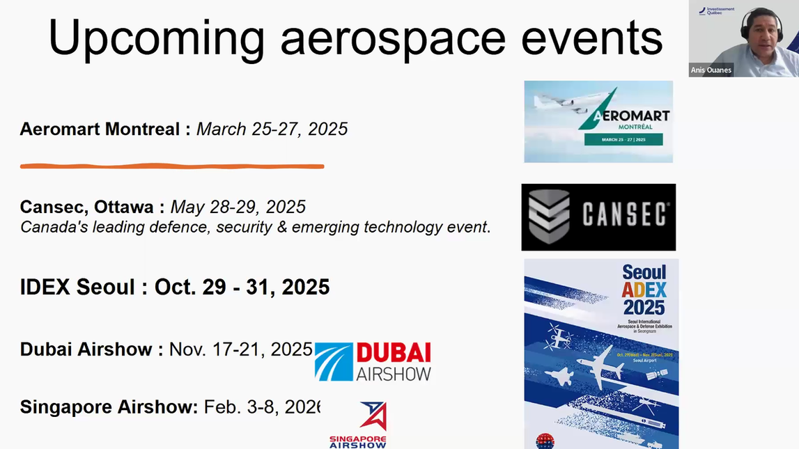 The 2025 Aerospace Business Opportunity Webinar brought together an influential network of aerospace professionals, investors, and industry experts to explore emerging opportunities in Quebec Korea aviation and aerospace sectors. The event featured presentations from both Korean and Quebec aerospace industry partners, showcasing their latest projects, innovations, and areas where they are seeking international collaboration. Attendees also participated in dynamic panels and live discussions covering topics such as sustainable aviation, advanced manufacturing, supply chain optimization, and the integration of AI and digital technologies. Beyond insights, the webinar fostered strategic connections, allowing startups, SMEs, and large enterprises to discover potential partnerships, market expansion strategies, and collaborative projects. This forward-looking event highlighted the region’s growing role in the global aerospace ecosystem while providing actionable knowledge for participants to accelerate innovation and cross border growth.